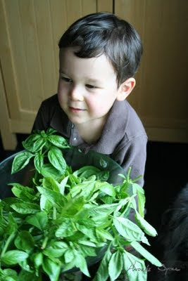 Antonio and I harvested a bumper crop of our herbs, mostly basil (of all three varieties I grew this year), but also some oregano and mint as well to tide us over for the winter. He was so proud of the harvest, that he would show each container to Julia, so she could see it and smell it. I am in the process of drying most of the herbs (so our house smelled strongly of basil last night). We are planning to make some pesto to freeze with some of it, and I may experiment with making Lemon Basil Vinegar.