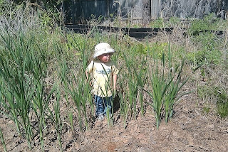 This past weekend I transplanted the majority of my tomatoes into the garden, most going into the raised bed. And on Sunday night I put together the vertical frame for the raised bed, which the tomatoes and cucumbers will climb up. Antonio is very excited about the progress of the radishes in the raised bed, which he is currently confusing with a tomato (probably due to its color).