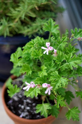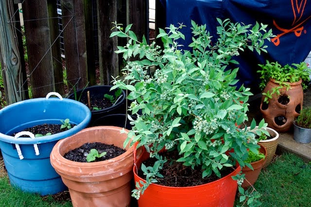 Last weekend Antonio and I bought ourselves a few plants for our garden. Some of the plants we bought were a Strawberry plant, that had two strawberries ready for picking already on it, Lemon Thyme, and Stevia. Julia and I decided to give Stevia a try (although we grew it once years before, we didn't do anything with it then). We plan on possibly using it instead of sugar when possible. It can be done with either the green leaves, or by drying and then grinding the leaves into a powder (if we have enough, we may plan on doing both). Approximately 6 large leaves chopped finely is a substitute for 1/2 cup of sugar for baking or in cooked recipes. 1 teaspoon of ground stevia is equal to 1 cup of sugar; 2 drops of liquid essence is equal to 1 teaspoon sugar. Antonio and I also picked up a Citronella Scented Geranium, we'll see if it works in keeping the mosquito population away from our patio some. Here is a picture of one of our two blueberry bushes at the end of April.