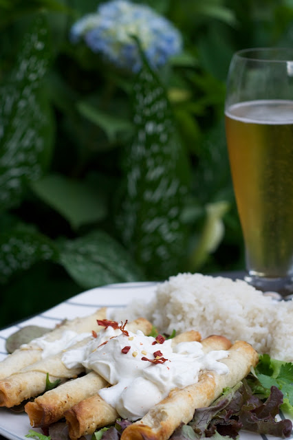 A bed of lettuce with cilantro, radishes and lemon basil topped by taquitos and sour cream with minced dried cayenne peppers (from last years garden), rice and a beer. We are not home-brewing our own beer yet, but that is a dream of mine, some day. So if you couldn't guess the non home grown ingredients: taquitos, sour cream rice and beer. But we have talked about making our own taquitos, I think that is very feasible. The next time we make some homemade tortillas we just need to save a few to wrap and then fry as taquitos (although this leans heavily on Julia's expertise, mine tends to run more for the outdoors).