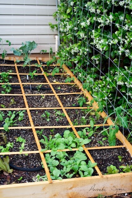 This past weekend I transplanted the majority of my tomatoes into the garden, most going into the raised bed. And on Sunday night I put together the vertical frame for the raised bed, which the tomatoes and cucumbers will climb up. Antonio is very excited about the progress of the radishes in the raised bed, which he is currently confusing with a tomato (probably due to its color).
