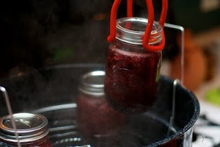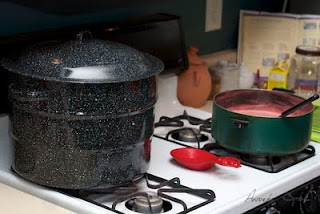 She then got out our canning pot, and boiled the jars and filled them, so that they stand ready for our later enjoyment.