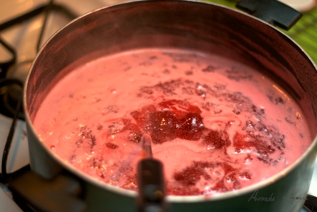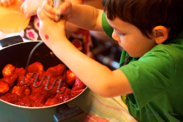Last week Julia preserved some of the strawberries that we had picked from a local farm, as Strawberry Jam. The kids got into the action by helping mash the strawberries down, each waiting eagerly to take their turn.