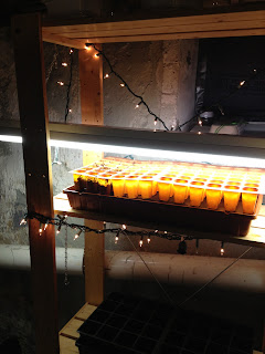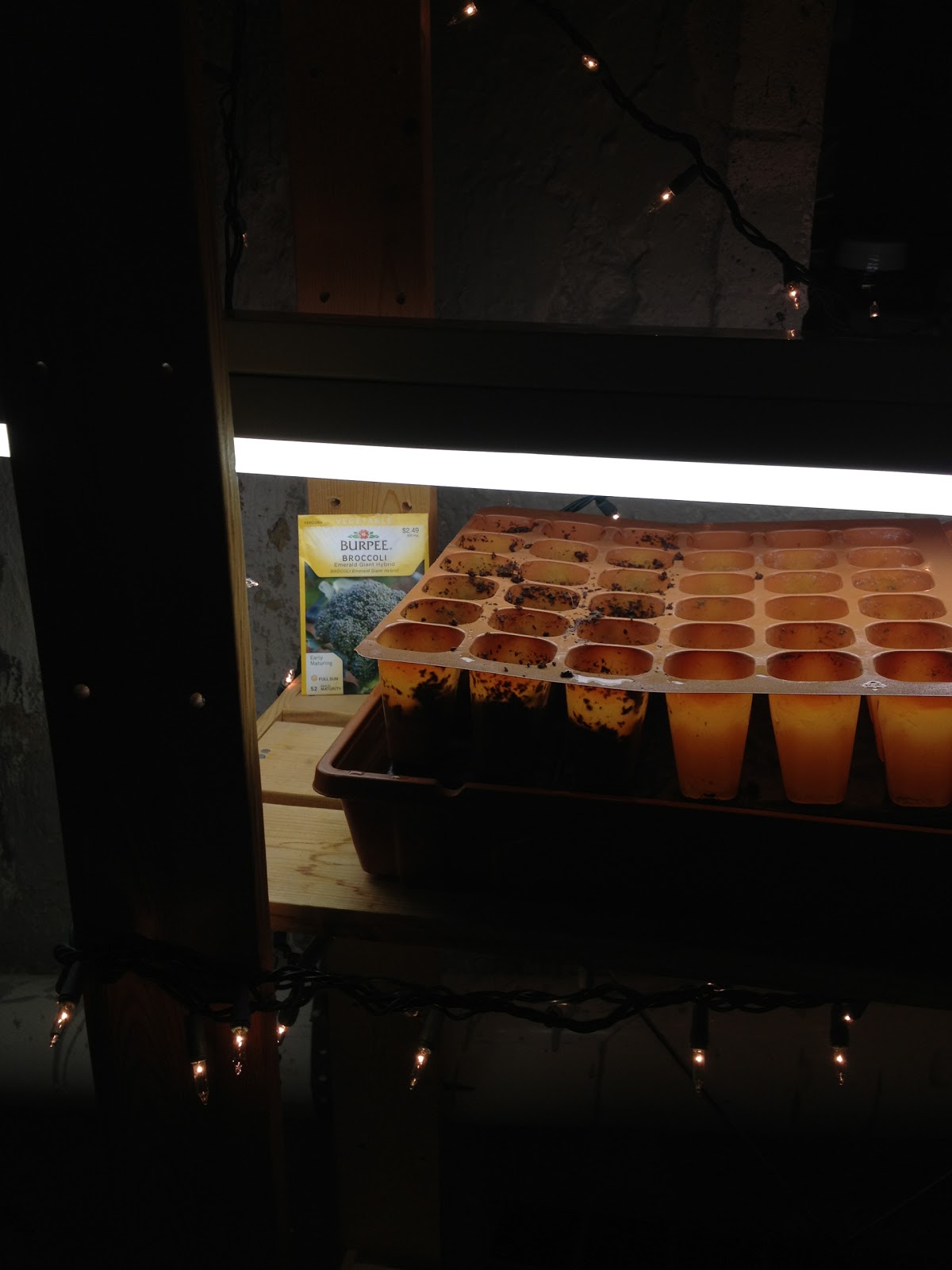 Work on the garden has finally begun here at the newly relocated Villa de Stell Garden here outside of Philadelphia. I have set up the seed starting area, which for the first time, I actually have plenty of space, and don't have to squeeze into the room to be able to access the seed starts. I even have an old drafting table that will work as my "potting bench". The seed starting set up is now in the basement, which we've never had before, so I have plenty of space and am not encroaching on my wife's space anymore, which I know she's happy about. And I am happy that I have access to the utility sink nearby, so watering is even going to be that much easier. So what was started. So far I sowed 18 Broccoli plants. I am using out of season Christmas lights to hopefully bring the temperature up a bit, and act as an homemade seed starting warmer.
