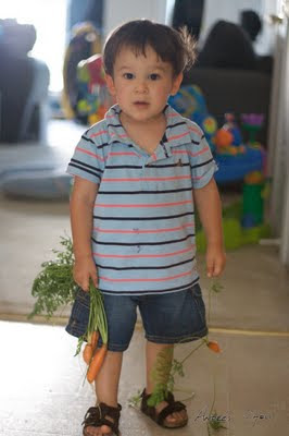 This past week we harvested a handful of carrots that had started to crest up out of the soil. Antonio was intrigued, perhaps due to having seen the episode of Curious George where George grows and then later picks carrots.
